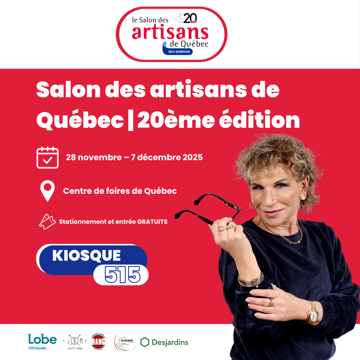 20e édition, du 28 novembre au 7 décembre 2025. Je serai au kiosque 515 avec mes montres et bijoux personnalisés.