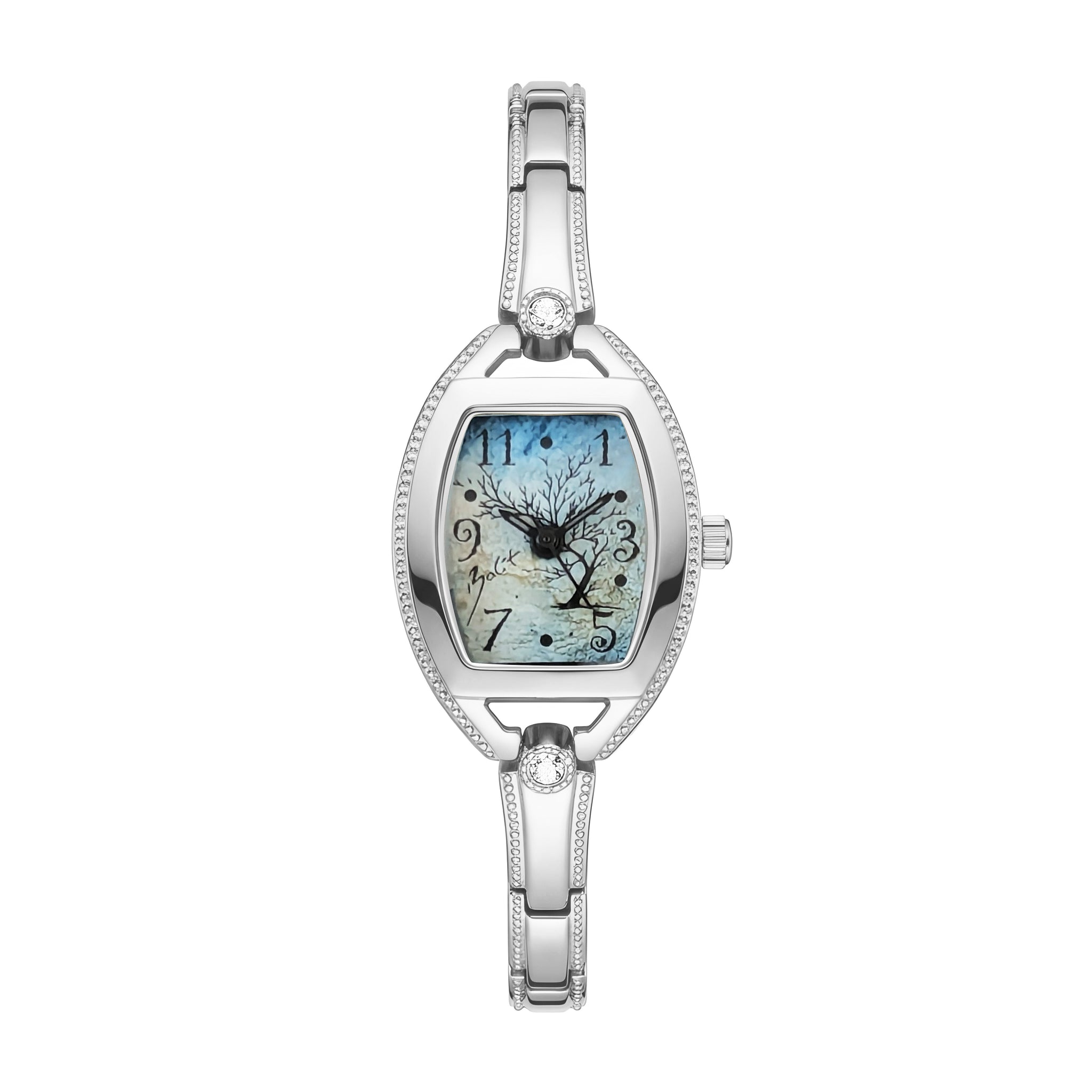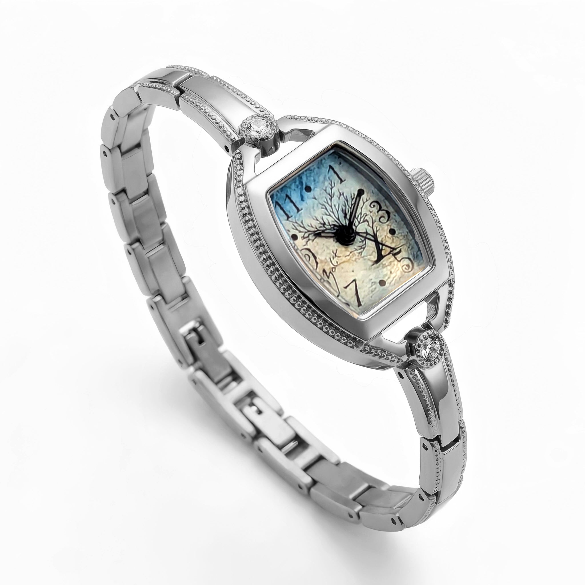 Élégante montre rétro au boîtier en acier inoxydable, ornée d'un cadran arbre peint à la main et traité à haute température pour une durabilité exceptionnelle. Le bracelet à mailles ajustables épouse parfaitement le poignet, tandis que les deux zircons qui encadrent le boîtier ajoutent une touche de raffinement intemporel à cette pièce de caractère.