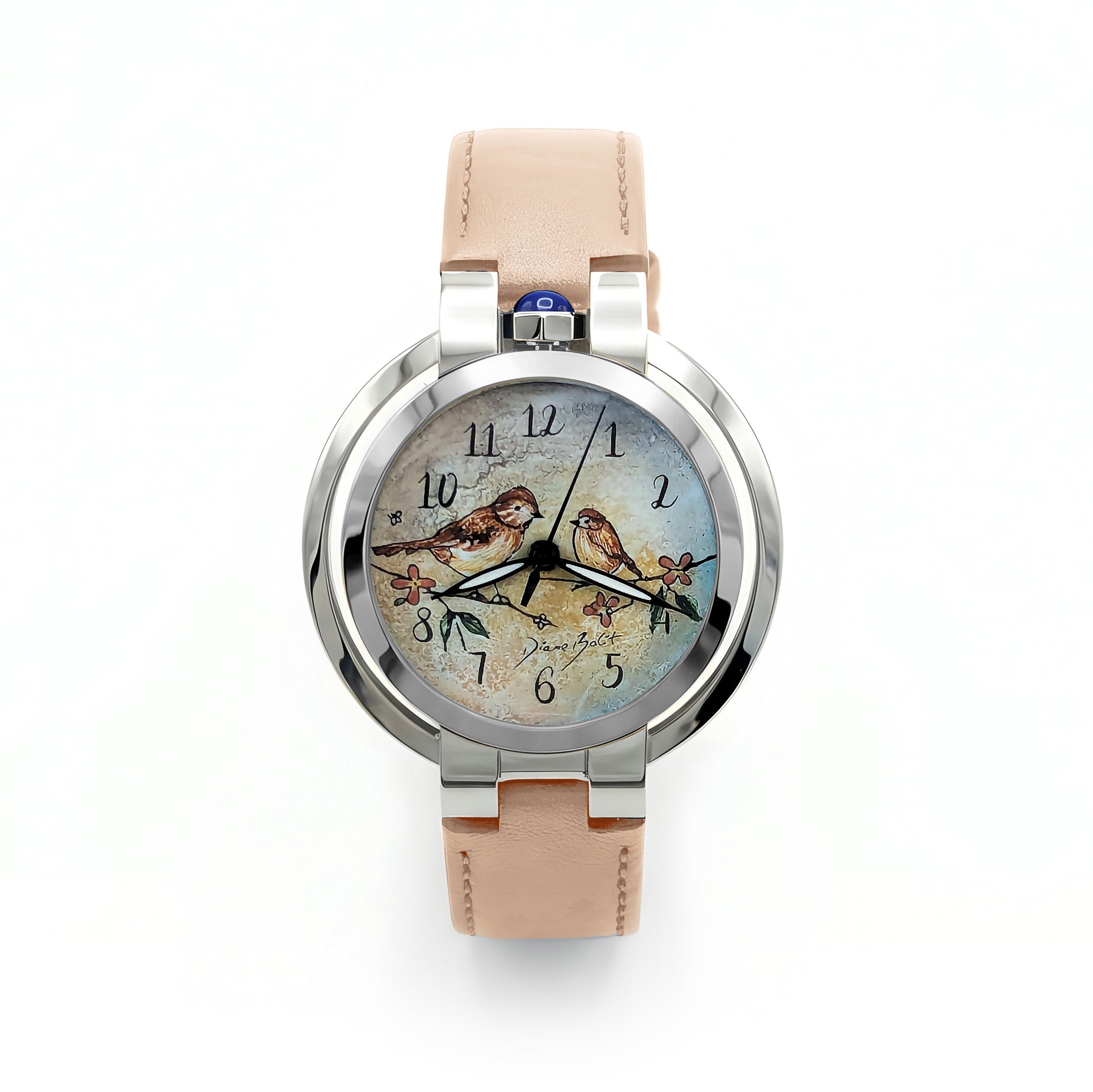 Montre Sphère raffinée : boîtier acier inoxydable, cadran émail peint à la main avec deux oiseaux sur branche, bracelet cuir véritable et fermoir papillon.