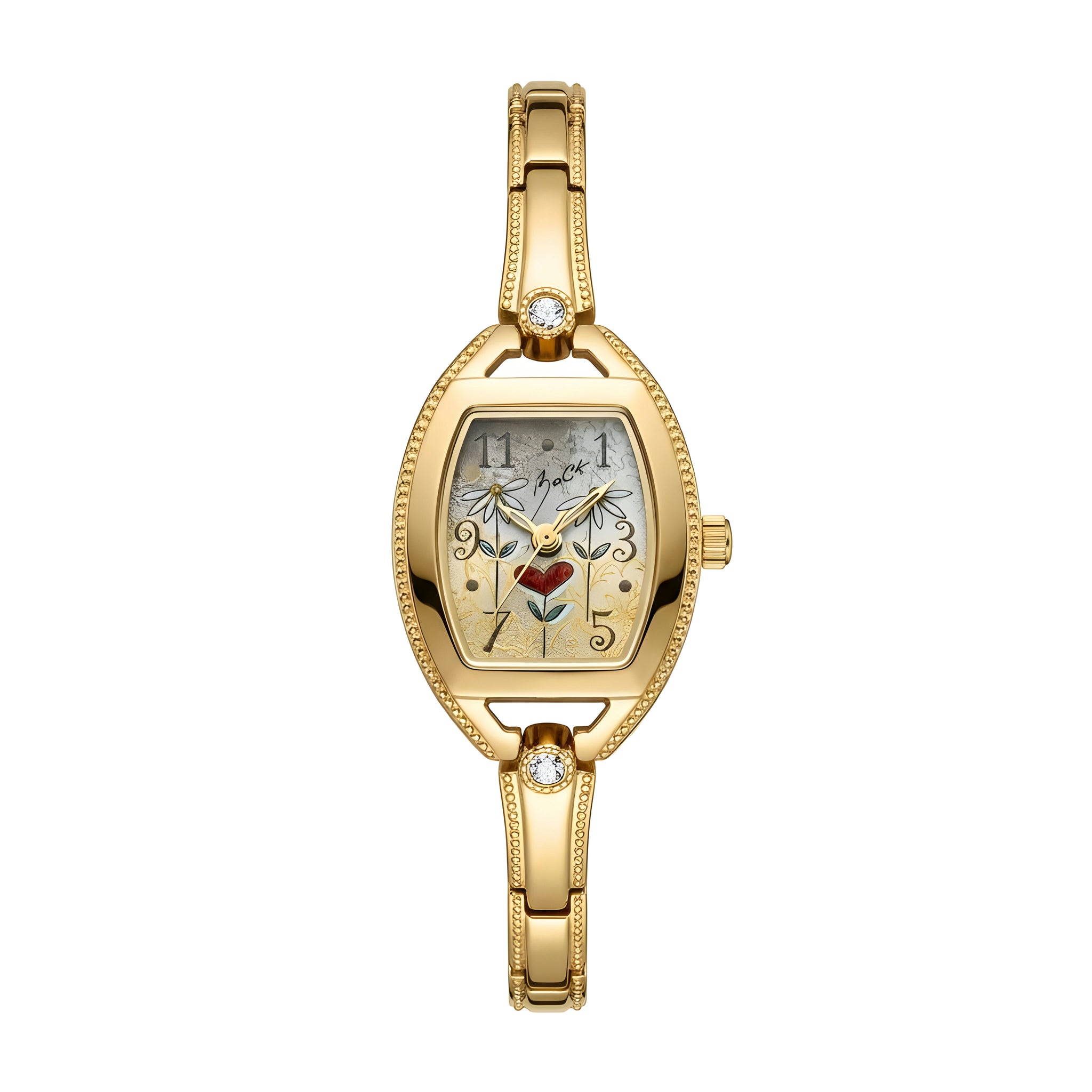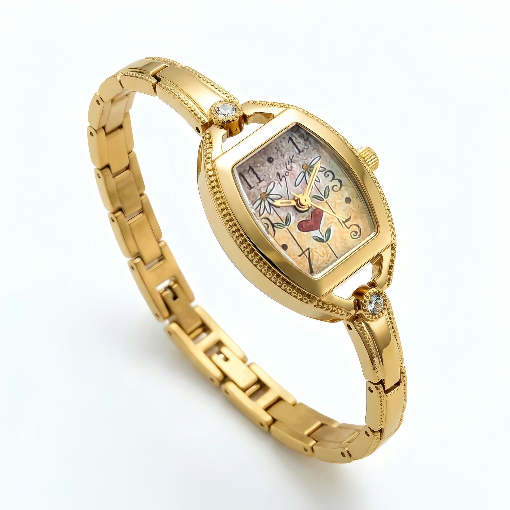 Élégante montre rétro munie d'un cadran émaillé peint à la main et cuit à haute température, présentant deux marguerites délicates et un cœur touchant. Le bracelet en acier inoxydable fini doré 18 carats, enrichi de deux zircons scintillants, apporte une touche de luxe discret. Les mailles réglables assurent un ajustement parfait pour un port quotidien sans compromis sur le style.