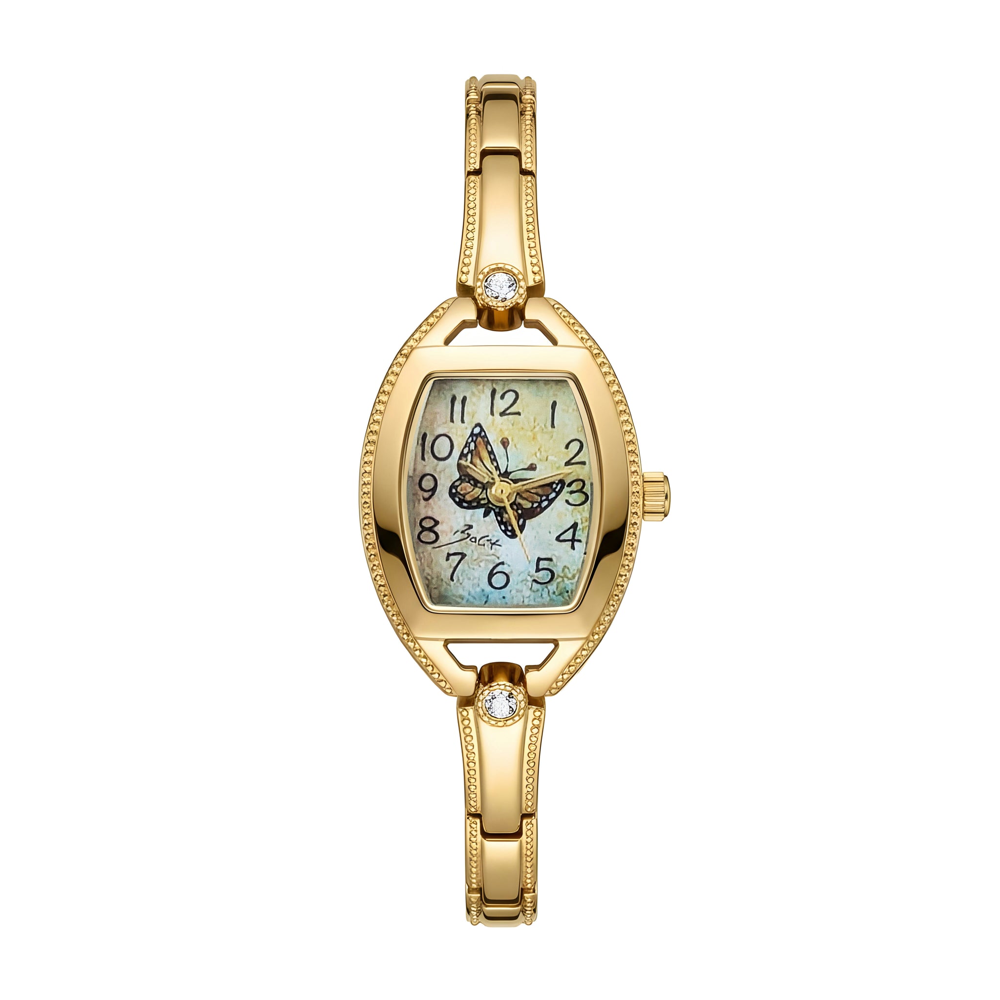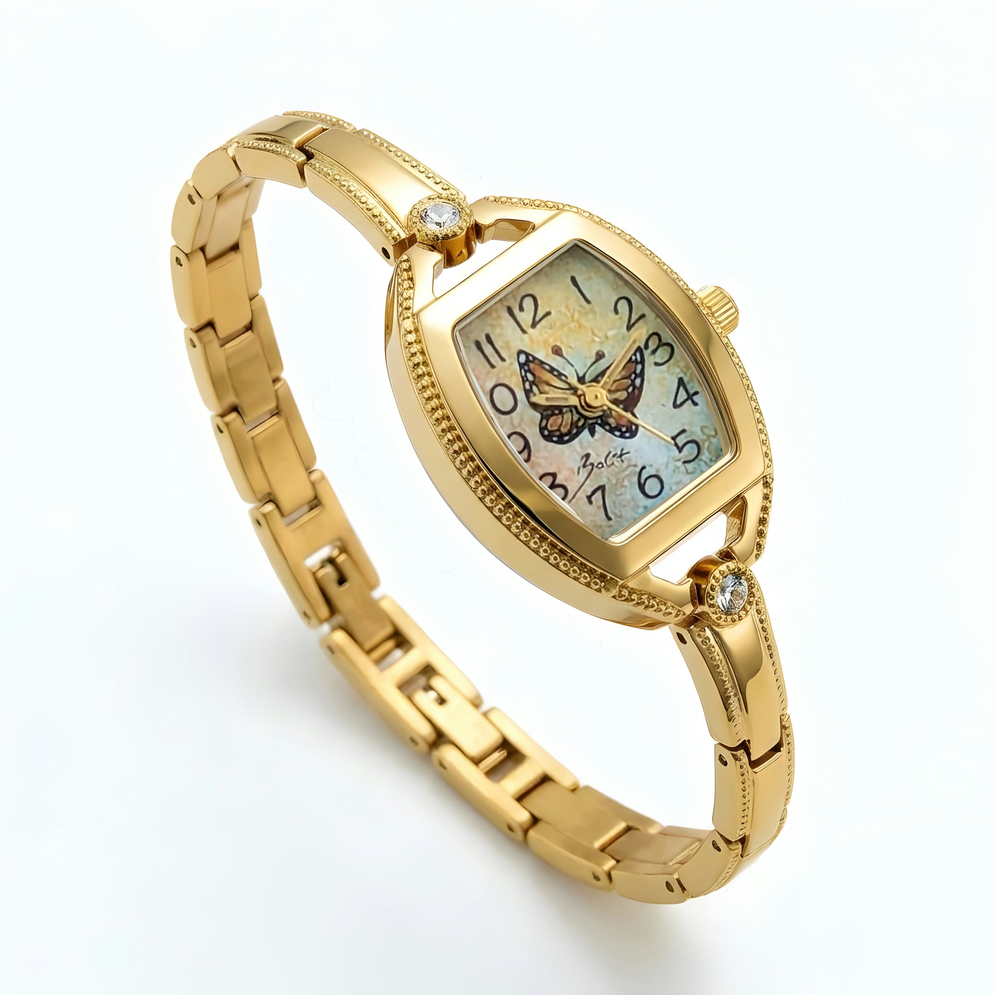 Montre rétro élégante avec bracelet en or 18 carats à maille ajustable, cadran papillon peint à la main et boîtier orné de deux zircons.